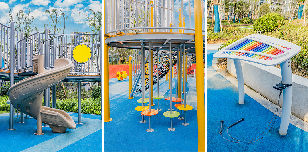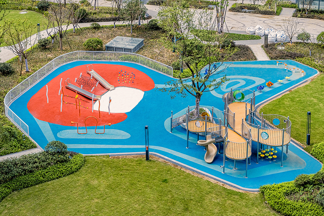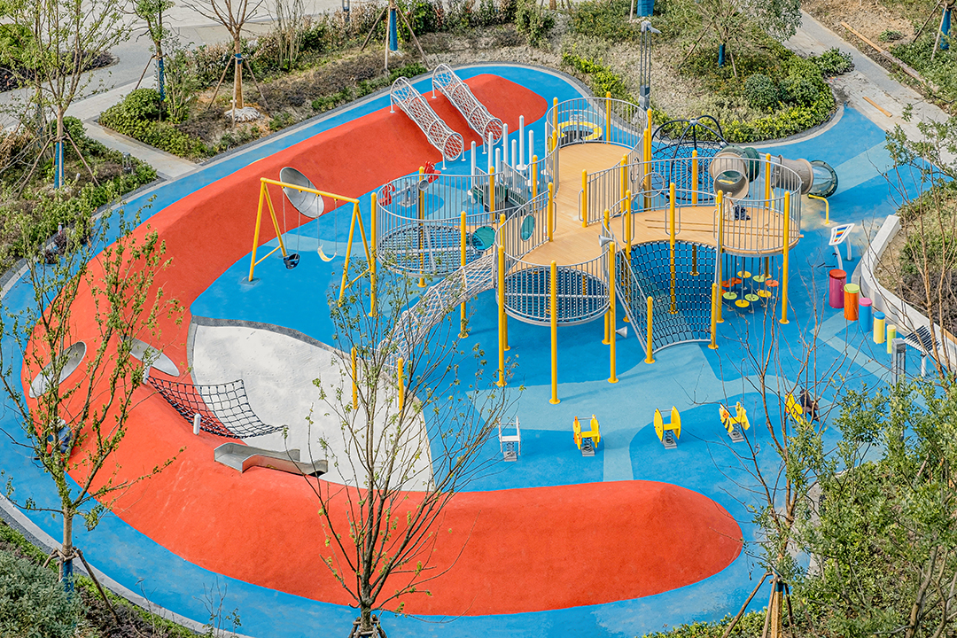 项目位于浙江省杭州市富阳区秦望小区。飞鲸游乐设计团队以为儿童创造出良好的游乐玩耍环境作为出发点,从材料、色彩、形态等去做设计,在儿童玩耍的同时以培养他们的美好情操,陶冶心灵,融入自然,寓教于乐。色彩上我们选用了鲜艳明快的颜色,用以区分不同的空间领域,场地通过不规则的铺装变化,在整个景观设计相协调的基础上突出特色,调动儿童的积极性,增加了游玩的乐趣。整体设计以未来儿童的真实需求为设计出发点,打造出了一个充满童趣的儿童游乐空间,为周边居民提供了一个遛娃好去处。