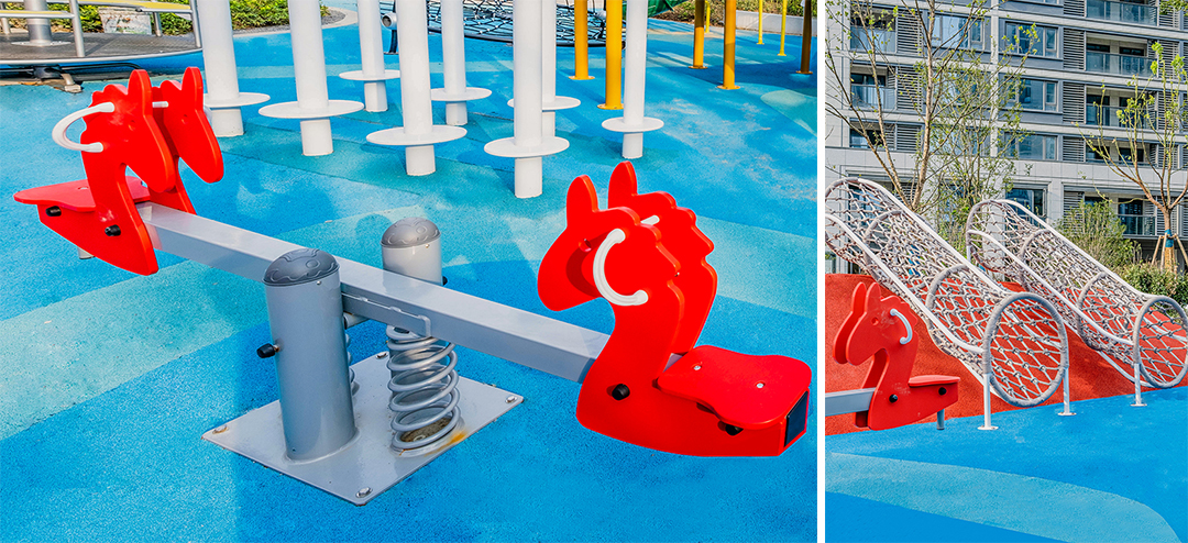 场地布置不同功能设备,涵盖了攀、爬、跑、跳、钻、滑、荡等方面,满足孩子们不同的游玩需求。色彩上运用红与蓝的色彩碰撞,侧面激发儿童潜在活力。