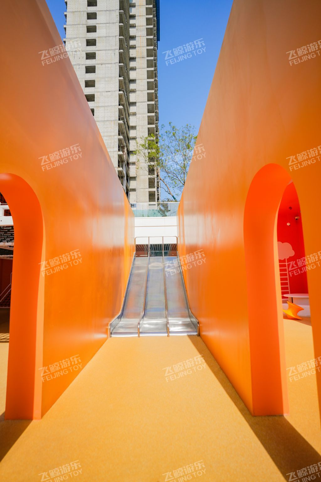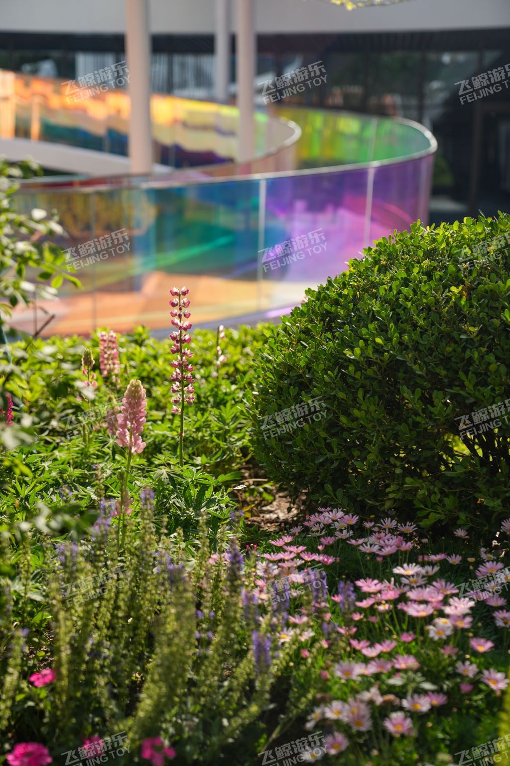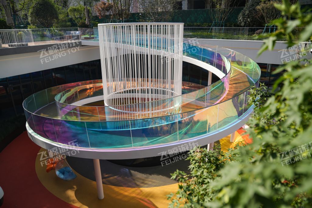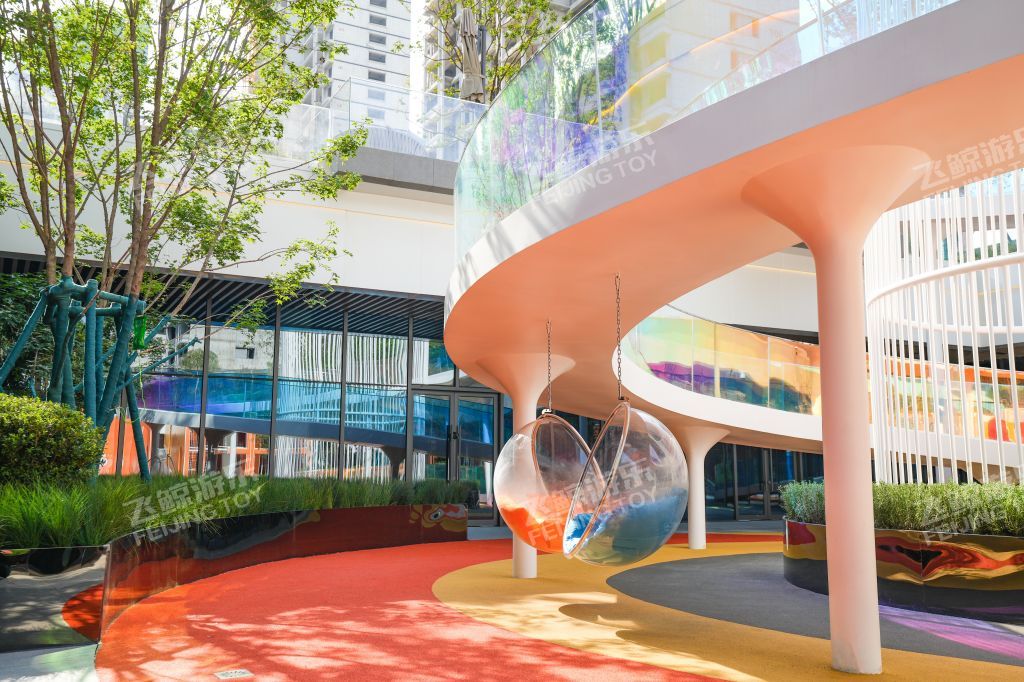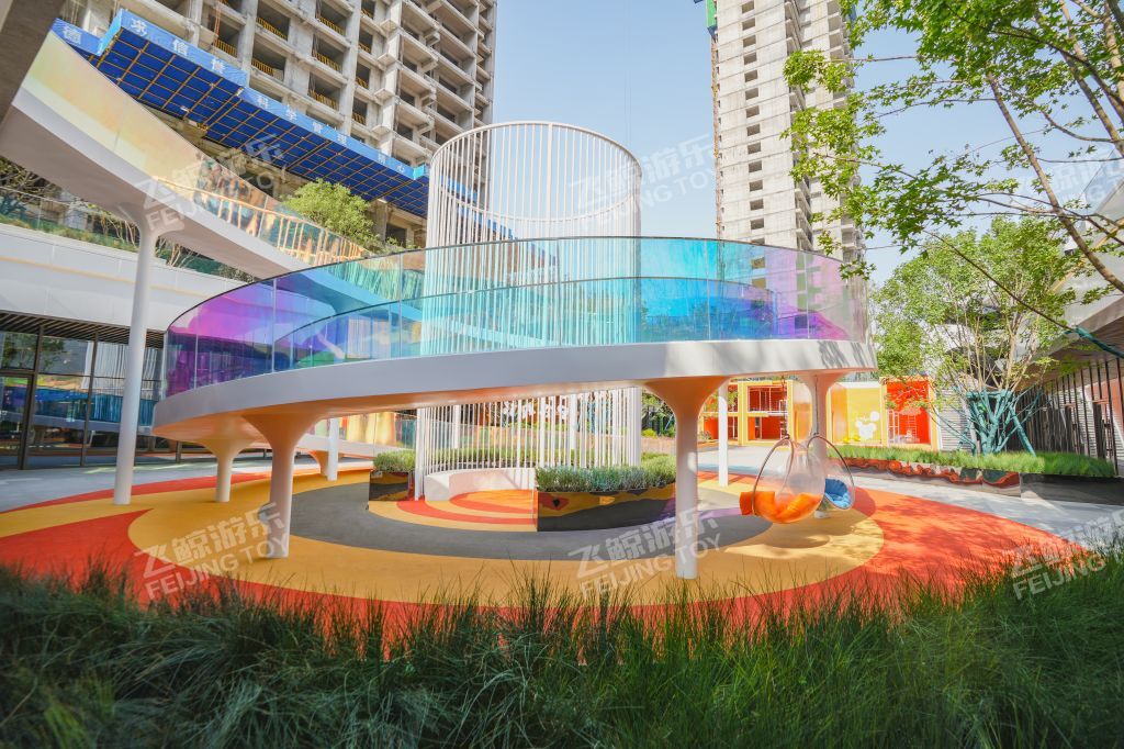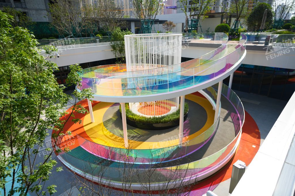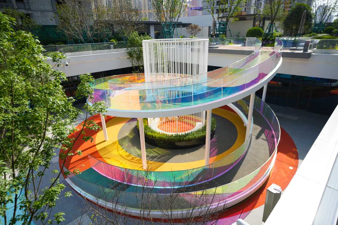 廊架延伸连接地面至下沉广场,通体围栏采用炫彩玻璃材质,不同角度折射出不同色彩,形与色,光与影之间创造出一种多维空间的沉浸式体验。红橙搭配地垫,为孩子们奔跑蹦跳玩耍提供缓冲保障。内部坐凳休憩感受阳光。廊架下是休憩好去处,孩子们嬉戏奔跑,在柔软泡泡椅里沐浴阳光,感受惬意时光。